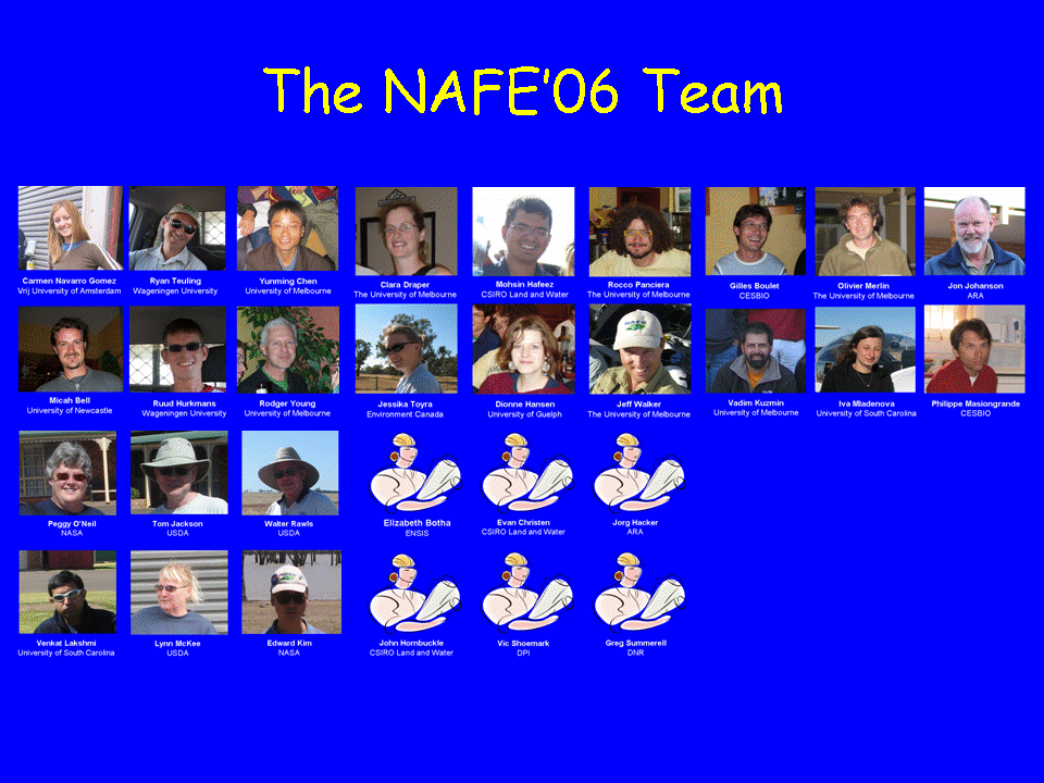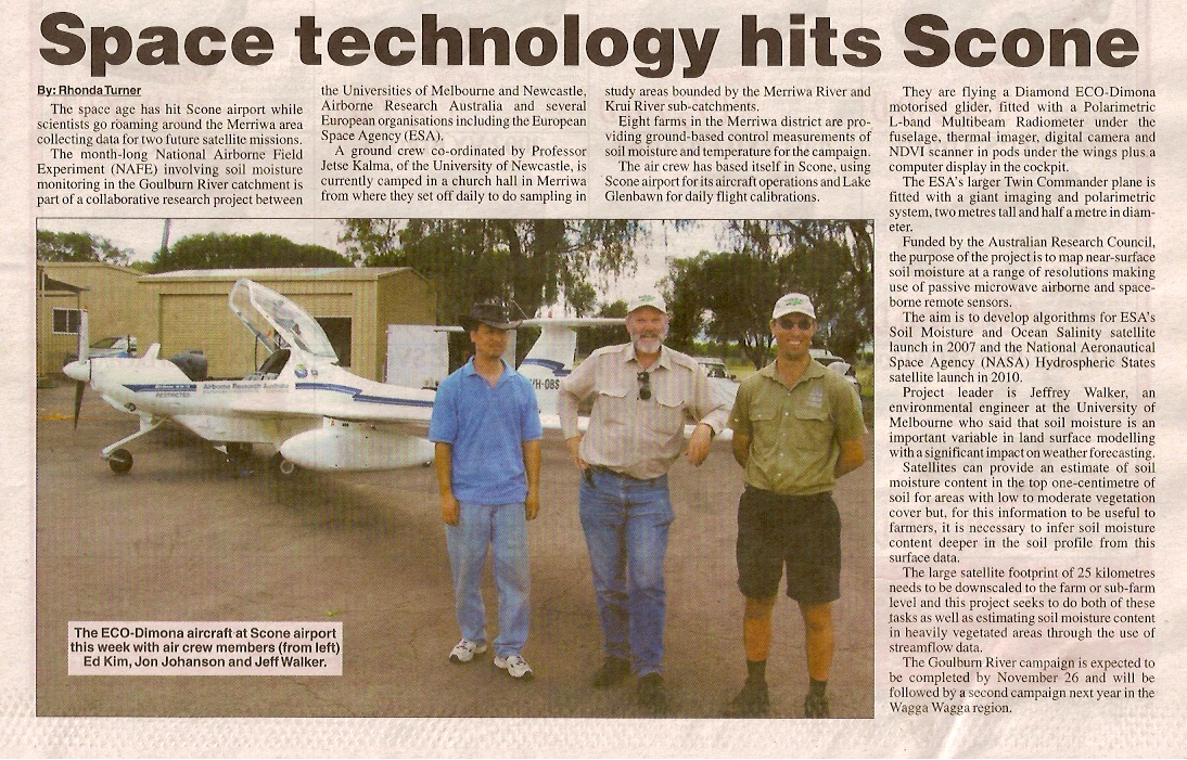 - Walker, J. P., Panciera, R., Merlin, O., Kalma, J. D., Kim, E. J. and Hacker, J. M., 2006. The National Airborne Field Experiments, Geophysical Research Abstracts [CD-ROM], 8, EGU06-A-03766, EGU General Assembly, Vienna, Austria, April 2006.